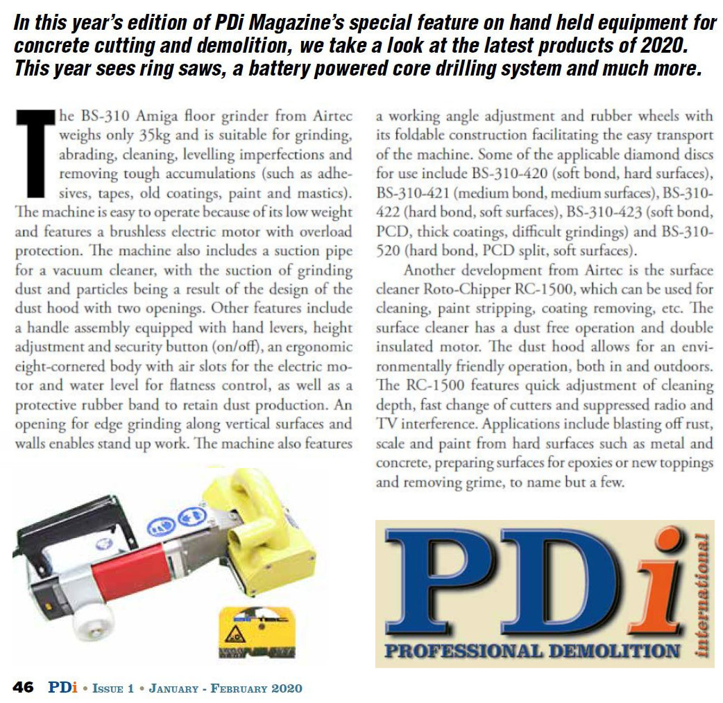 Das „Professional Demolition International (PDi) Magazin“ berichtet in seiner Neuheiten-Vorschau auch über zwei AIRTEC-Produkte. Erwähnt werden die sehr leistungsfähige, neuartige Bodenschleifmaschine BS-310 AMIGA wie auch die handgeführte Sanierungsfräse Roto-Chipper RC-1500.