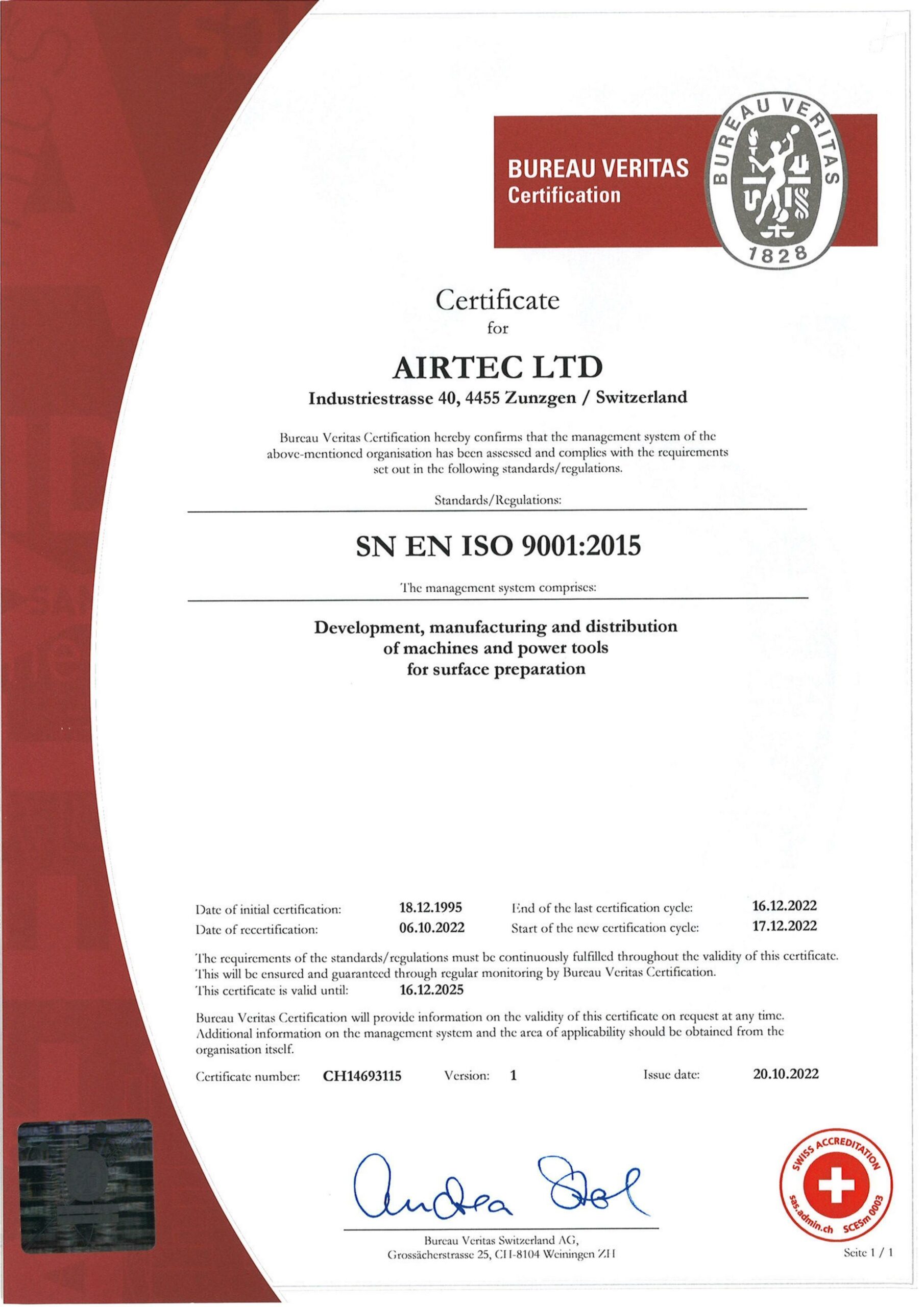 Bureau Veritas Certification hereby confirms that the Management AIRTEC has been assessed and fully complies with the high Quality requirements set out in SN EN ISO 9001:2015.