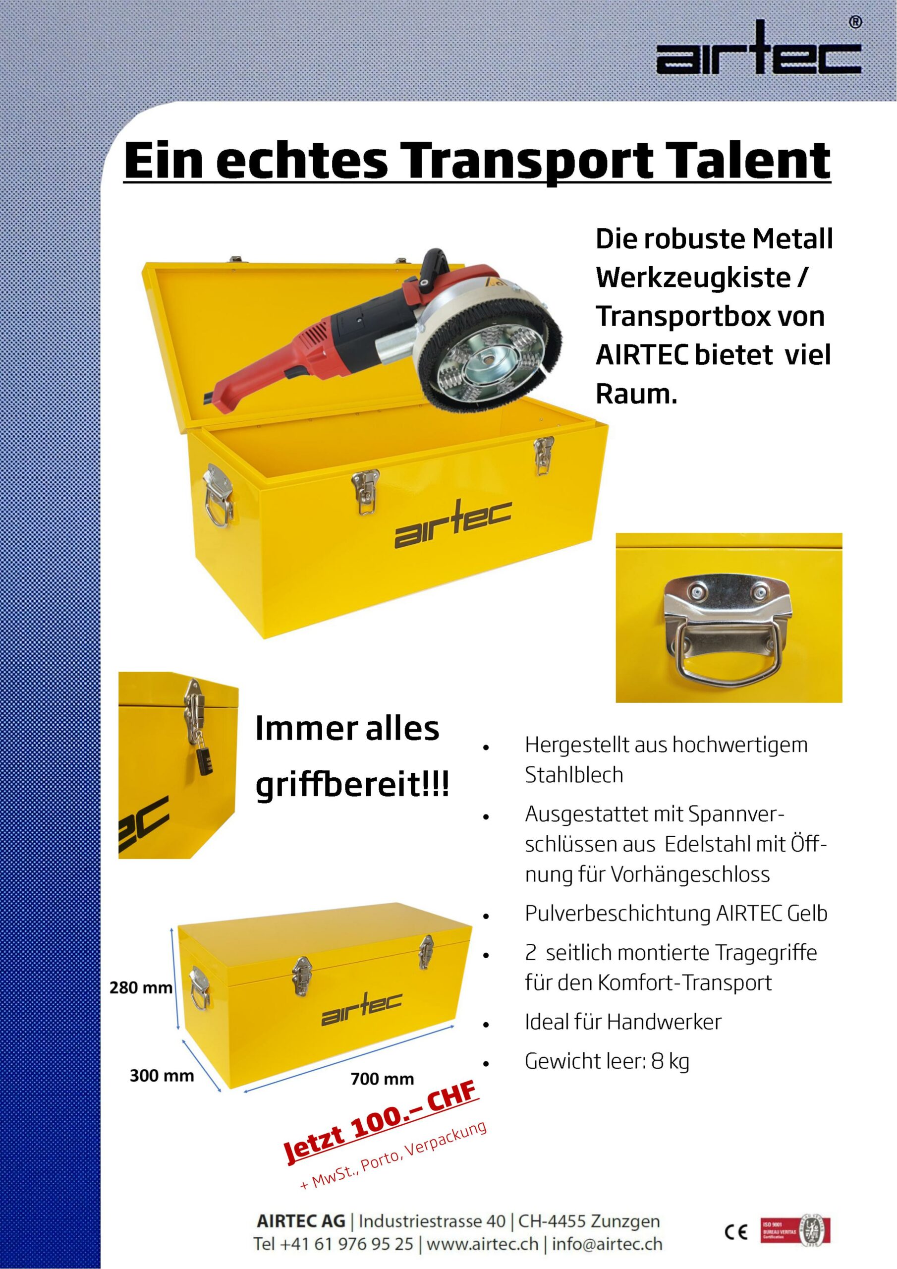 Die robuste Metall Werkzeugkiste / Transportbox von AIRTEC bietet viel Raum.