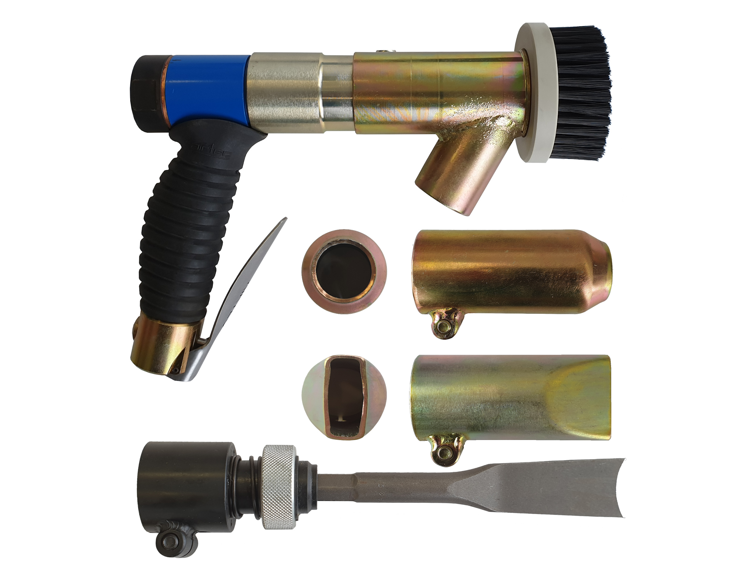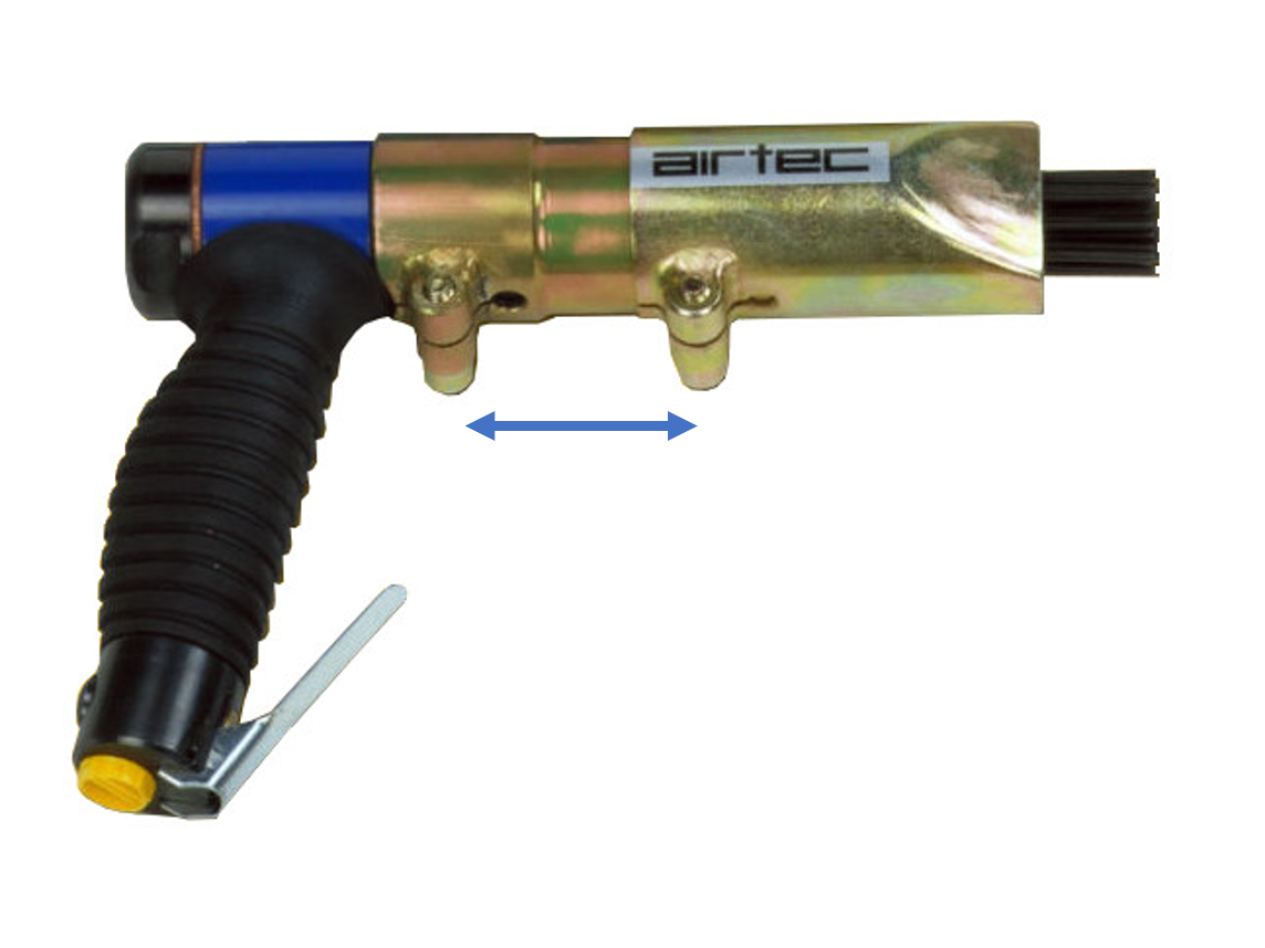 Druckluft Nadelentroster AT-0 mit Rohrzwischenstück und regulierbarem Kopfstück. Geeignet für das Entfernen von Farbe, Rost und Beschichtungen auf Stahl- und Beton-Oberflächen. Entfernt auch Rückstände in schwer erreichbaren Winkeln, Ecken und Rohrverbindungen.